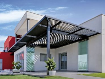 The motorised element is discretely hidden between the slats and the frame, promoting the beauty of the pergola.